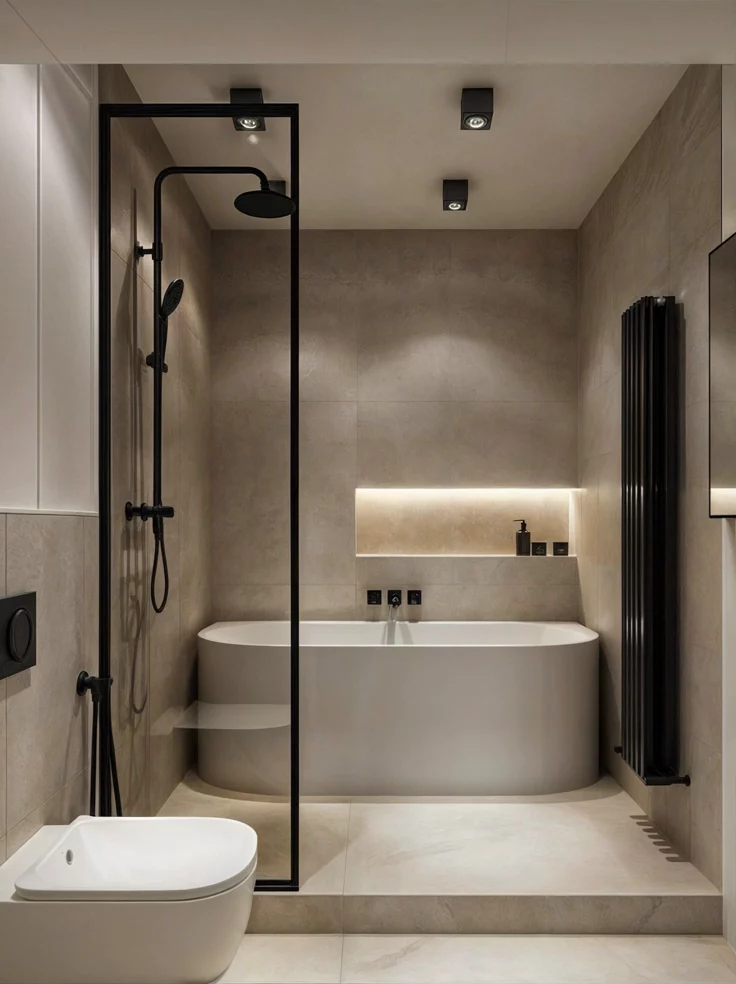 Отдельно стоит отметить новые материалы, которые усиливают цветовые тренды. В 2026 году активно используются микробетон, крупноформатный керамогранит с эффектом натурального камня, текстурированная глазурованная плитка, а также композитные материалы нового поколения — например Fenix-поверхности и ультратонкая керамика. Эти материалы позволяют создавать сложные оттенки и мягкие матовые поверхности, которые раньше было трудно реализовать в ванной комнате.